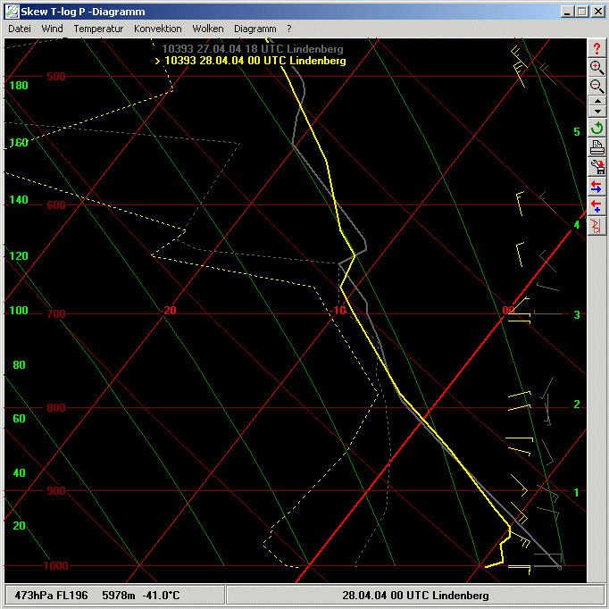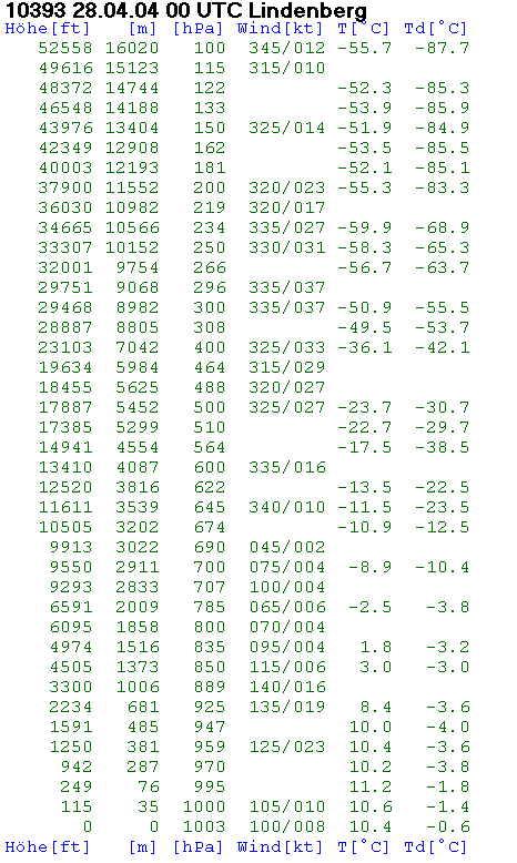 Die Graphik unten zeigt den Radiosondenaufstieg (Temp) von 18z und 00z. Es hat sich, wie in schwach windigen Nächten üblich, eine Temperaturinversion in den bodennahen Luftschichten ausgebildet. Im oberen Bereich der Inversion ist ein relatives Windmaximum mit 125° 23 kn gemessen worden. Das wahre Maximum kann zwischen 250 und 1600 ft liegen, liegt aber in diesem Fall eher zwischen 1000 und 1600 ft, da dieses Phänomen laut Literatur an der Obergrenze der nächtlichen Bodeninversion das Maximum aufweist. Ein Maximum von nahe 30 kn ist also aufgrund dieser Messung ebenfalls nicht ausgeschlossen. Man spricht hier von einem Low-Level-Jet ausgelöst u.a. durch die Inversionsbildung.