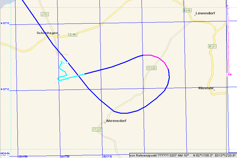Nachdem am Abend insgesamt nur schwacher Wind herrschte, fiel uns gegen 23:00 local time über Berlin starker Seitenwind auf. Das GPS schlug von Tempelhof TC von 240° nach W1 vor. Mit TH von ca. 225° konnte der Track dann gehalten werden. Auch der Blick aus dem Fenster zeigte gegenüber den Lichtern der Stadt eine starke Versetzung des Flugzeugs (auch der Kreiselkompass war nachgestellt).