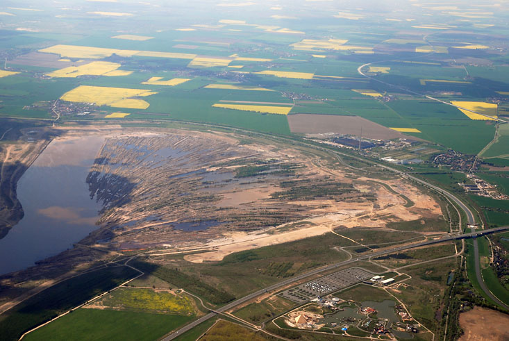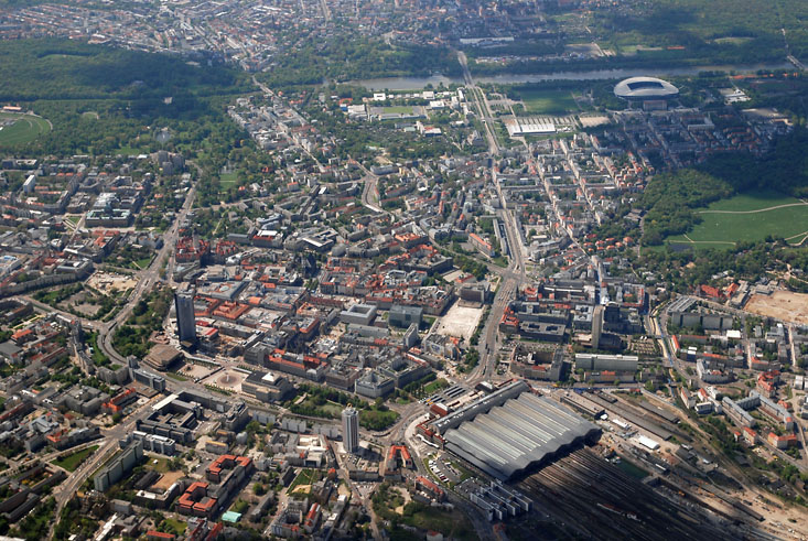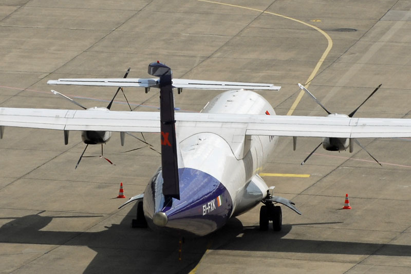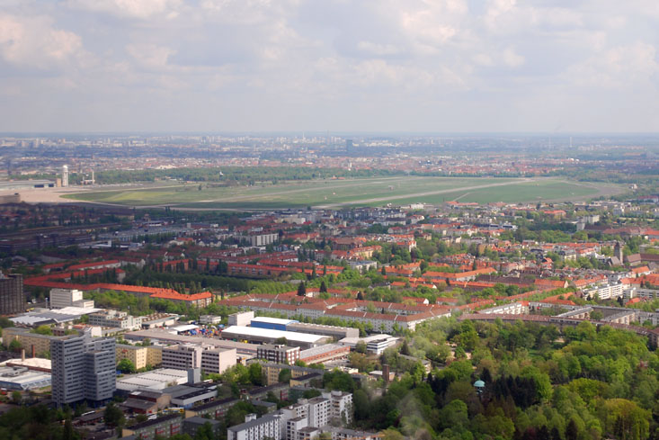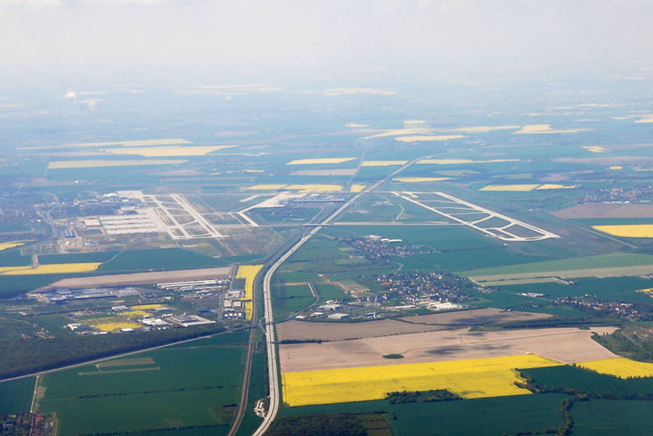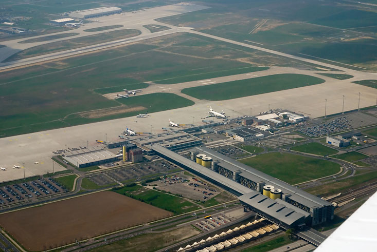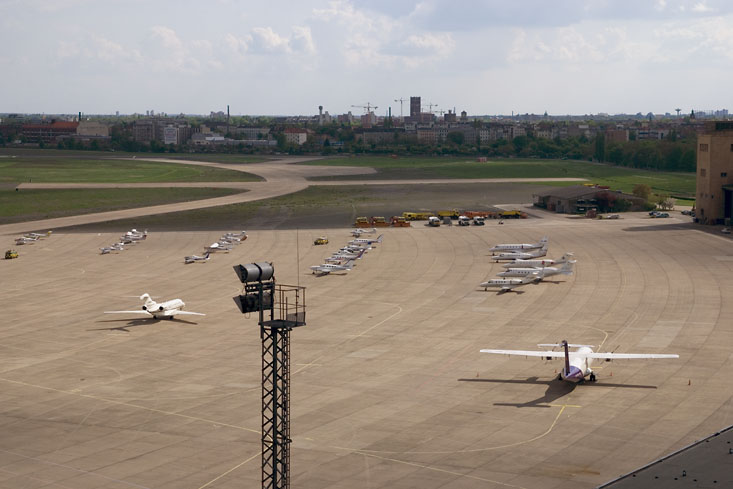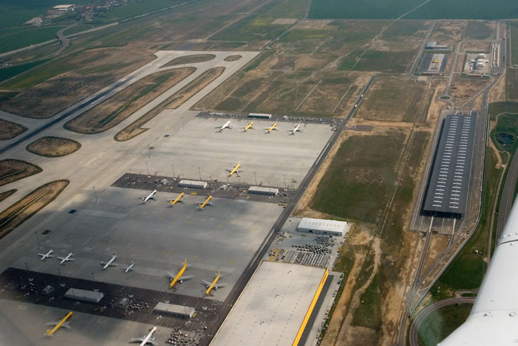 ![]() Blick vom Dach des Hauptgebäudes auf das nordöstliche Vorfeld mit einem Teil der abgestellten Flugzeuge |
