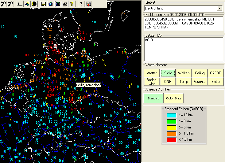 Auch das Wetter meinte es gut: Eine mehrtägige Hochdruckwetterlage mit optimalen VFR-Flugbedingungen sollte an diesem Wochenende beginnen. In Norddeutschland sorgte zwar noch eine feuchte Grundschicht sowie eine leichtes Schauer- und Gewitterrisiko am Nachmittag für Aufmerksamkeit, doch stellte sich dies später als weniger problematisch heraus. Unten stehende Graphik zeigt nördlich der Mittelgebirge recht schlechte Sichten, die auf Morgendunst und Nebel zurückzuführen waren und deren komplette Auflösung zur Zeit unserer Passage angenommen wurde. Im Zweifelsfall wären sie auch leicht zu überfliegen gewesen, der Flug war ohnehin im Wesentlichen als Funknavigationsflug geplant. ![]() Teil der meteorologischen Flugvorbereitung mit pc_met (DWD) Geplante Strecken/zugewiesene Pisten: |