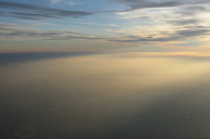 Mit der Sonne im Rücken sind Sichtweite und Kontraste etwas höher, die Inversionsschicht erscheint als graue Grundschicht. Oberhalb der Inversion ist die Luft trocken und klar, der Himmel erscheint tiefblau.