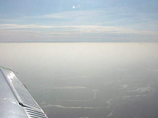So liegt bei bestimmten (*) Hochdruckwetterlagen im Winter eine Dunstglocke über der Landschaft, welche die Flugsichten und damit die terrestrische Orientierung bei VFR-Flügen mehr oder weniger stark beeinträchtigt. Vom Boden aus herrscht dagegen oft ein sonniger Eindruck und der Himmel wirkt je nach Blickrichtung blau oder etwas weißlich - weißlich vor allem in Richtung gegen die Sonne. (* windschwache Hochdruckwetterlagen ohne Kaltluftadvektion in höheren Luftschichten)