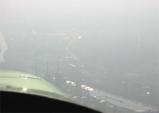 Trotz wolkenlosem Himmel und Sonne ist die Sichtweite stark begrenzt. Sie liegt wie hier mit der Sonne im Rücken bei 2 bis 3 NM, gegen die Sonne teilweise nur bei 1 bis 2 NM. (Im Bild der geschlossene Flughafen Heidelberg (ETIE).)