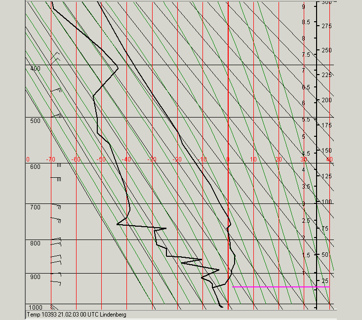 Zwar hat die Februarsonne die untersten bodennahen Luftschichten bereits erwärmt, es gibt aber eine kräftige Inversion in etwa 2500 ft Höhe, anschließend herrschen quasi isotherme, also ebenfalls stabile Verhältnisse, bei etwa 5000 ft liegt nochmals eine markante Inversion. Der Spread nimmt oberhalb der ersten Inversion bereits deutlich zu, die Luft wird also immer trockener (Spread in 5000 ft schon 21 Grad). Unterhalb der ersten Hauptinversion beträgt der Spread dagegen nur bei 2 bis 5 Grad.